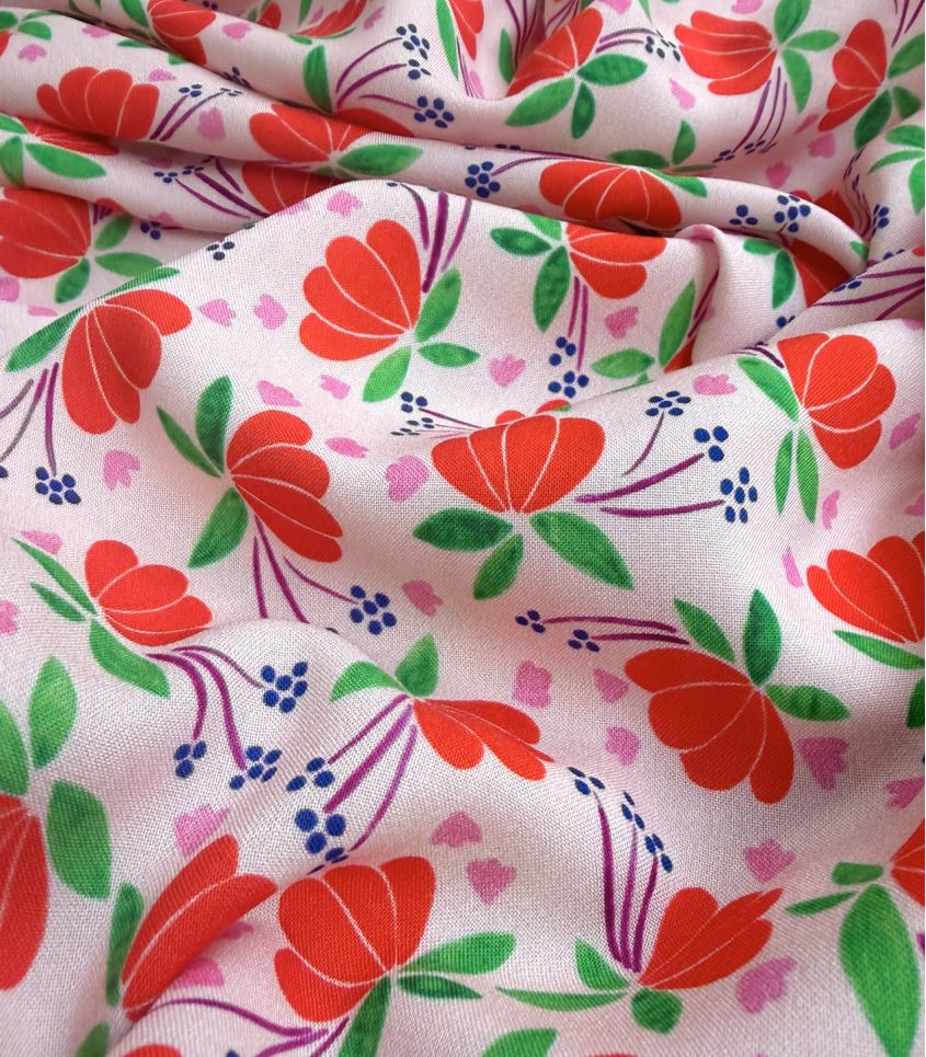 La viscose Coeur de fleur est un imprimé floral au caractère affirmé, où les pétales de fleurs éclatent sur un fond nude. Le contraste des couleurs apporte une vraie intensité visuelle, let's have fun !!