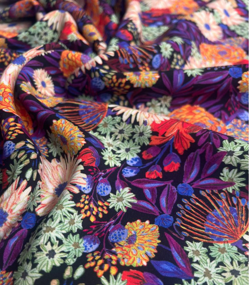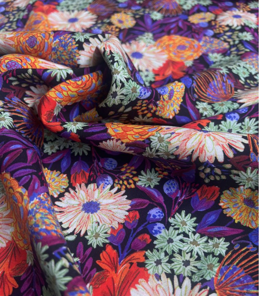 Viscose noire douce et fluide parsemée de fleurs peintes, une véritable plongée dans un jardin au coeur de l'automne. Cet imprimé est une véritable exposition de couleurs, il sera parfait pour toutes vos créations demandant de la fluidité, jupe, robe, blouse ...