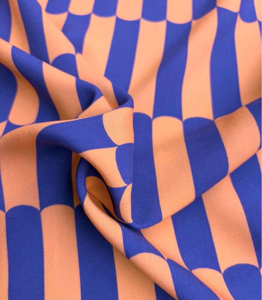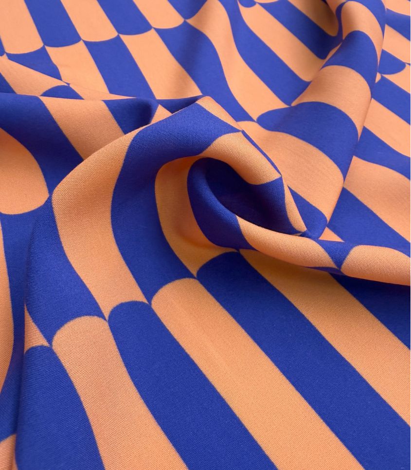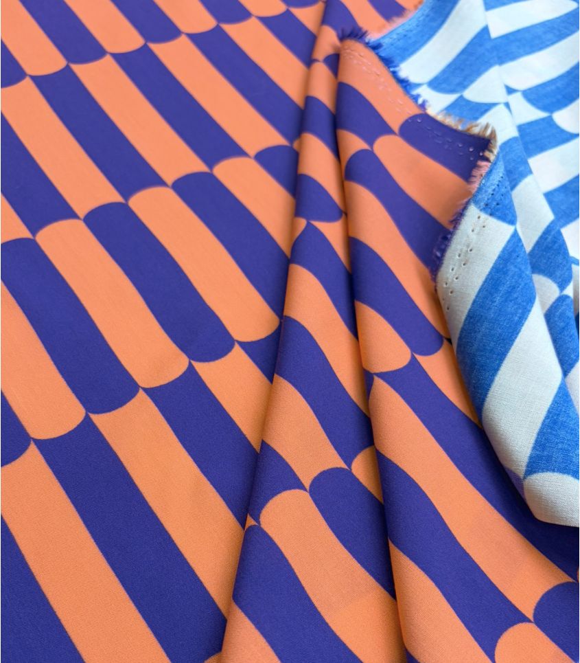 Viscose motif gaufrette orange clémentine et bleu roi. Imprimé joyeusement pop. Cette viscose fine et fluide sera parfaite pour réaliser des blouses, chemises, vêtements pour enfant.