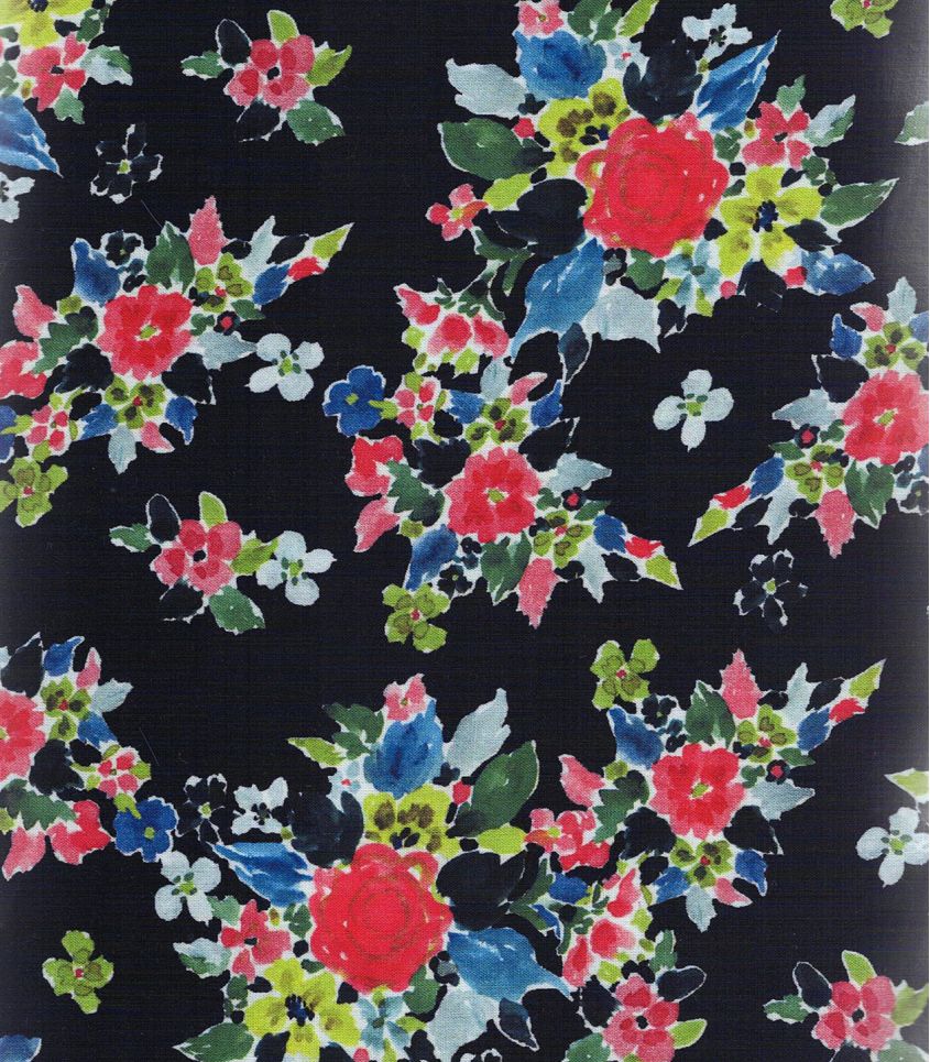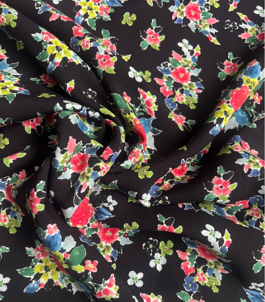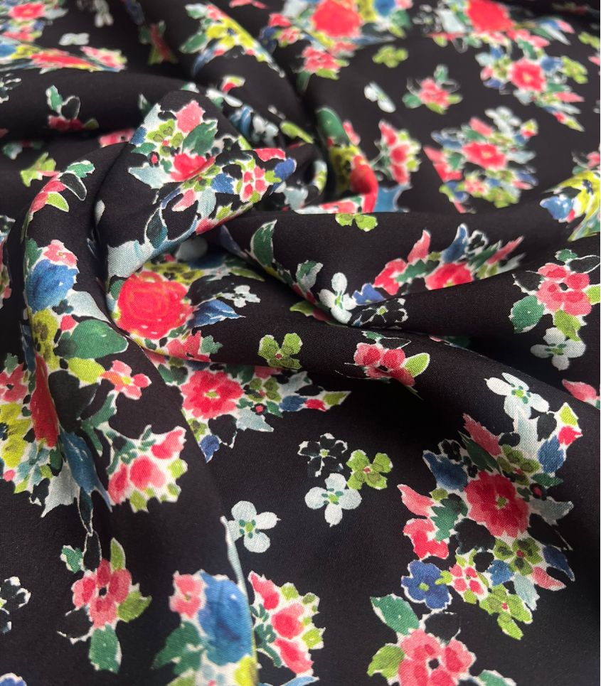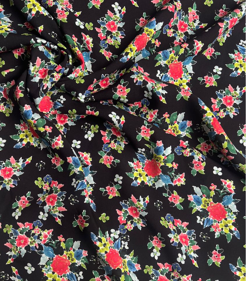 Viscose noire douce et fluide parsemée de petit bouquets de fleurs. Cet imprimé est une véritable exposition de couleurs, il sera parfait pour toutes vos créations demandant de la fluidité, jupe, robe, blouse ...
