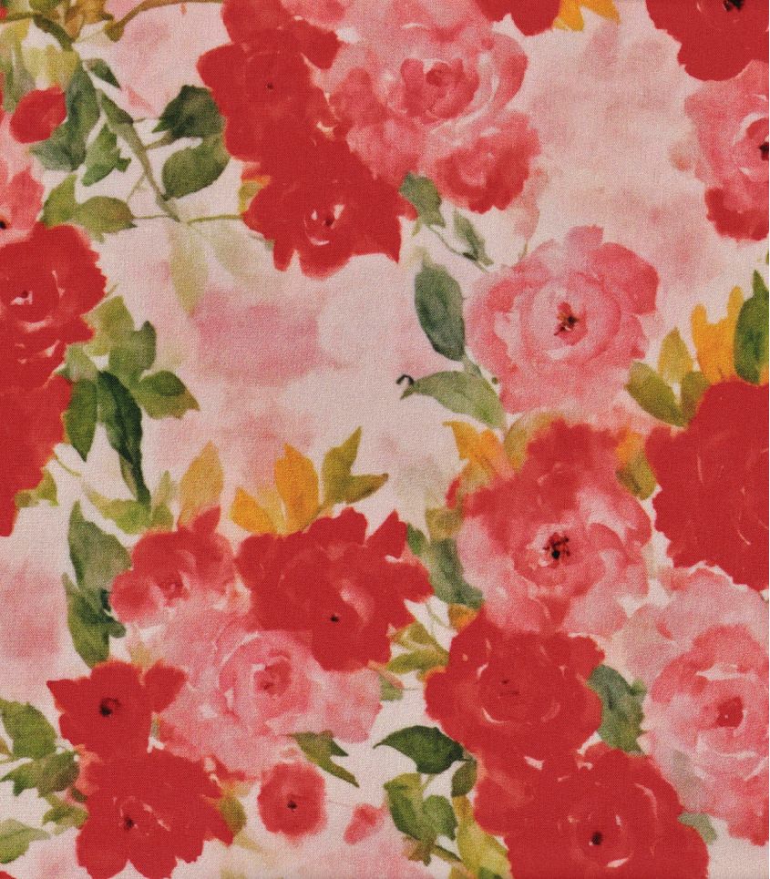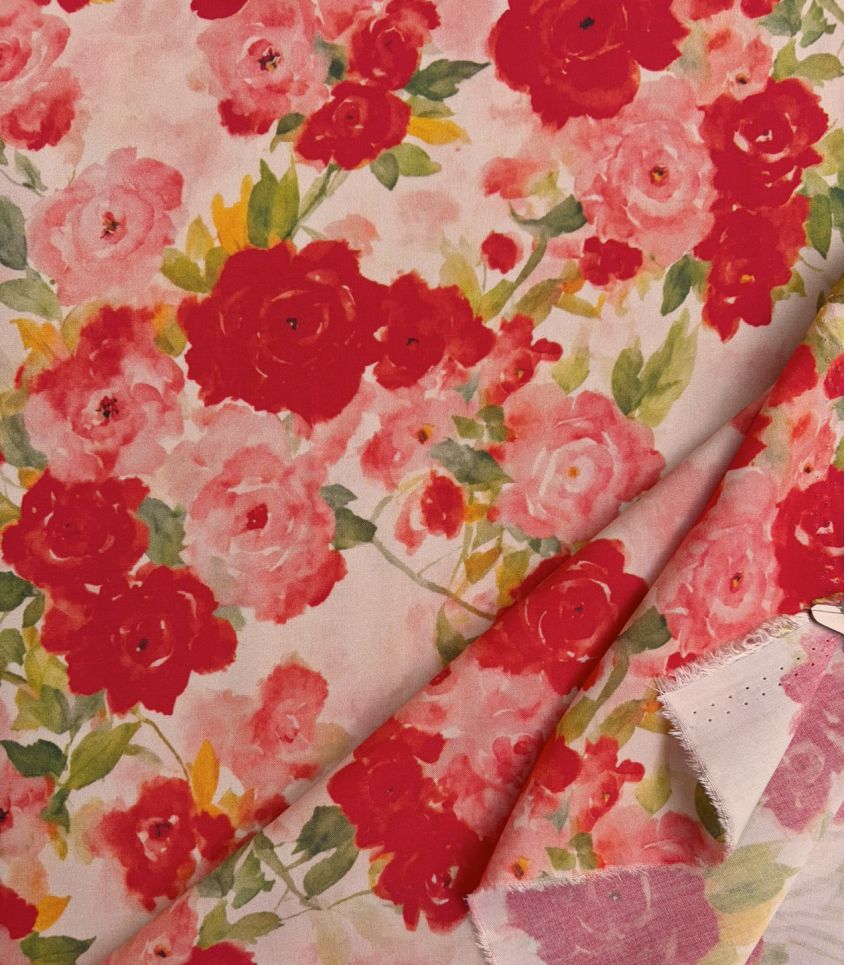 Viscose douce et fluide parsemée de belles rose rouges, le fond est légèrement rosé. Cet imprimé est une véritable exposition de couleurs, il sera parfait pour toutes vos créations demandant de la fluidité, jupe, robe, blouse ...