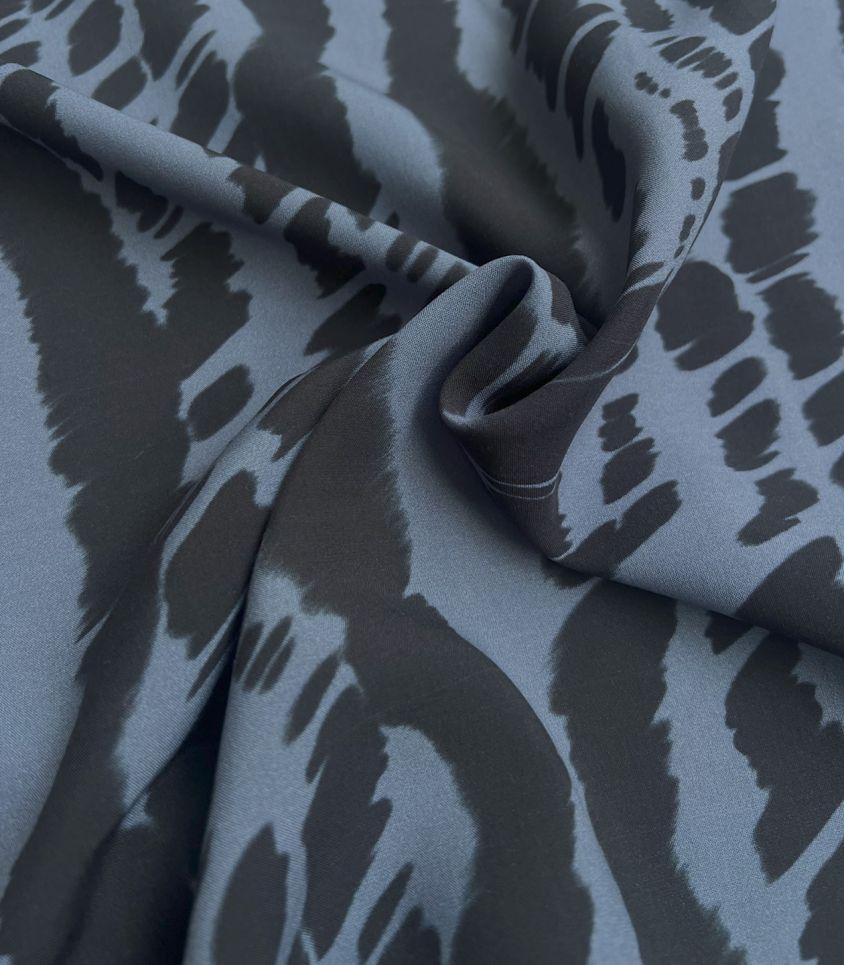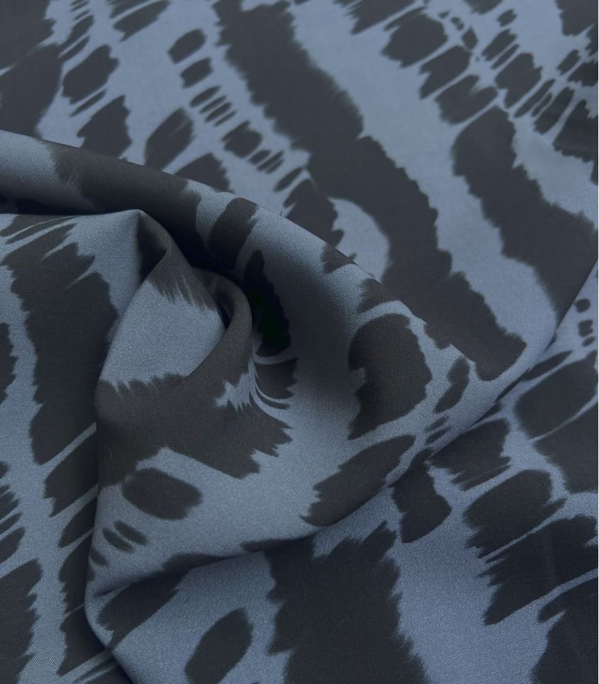 Viscose douce et fluide imprimé style tie and dye noir et bleu ardoise. Ce tissu sera parfait pour toutes vos créations demandant de la fluidité, jupe, robe, blouse ...