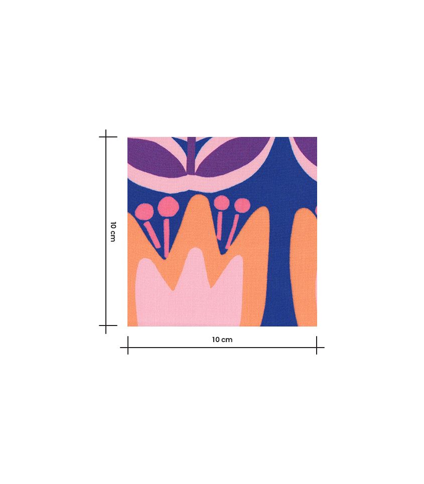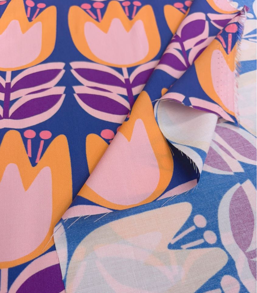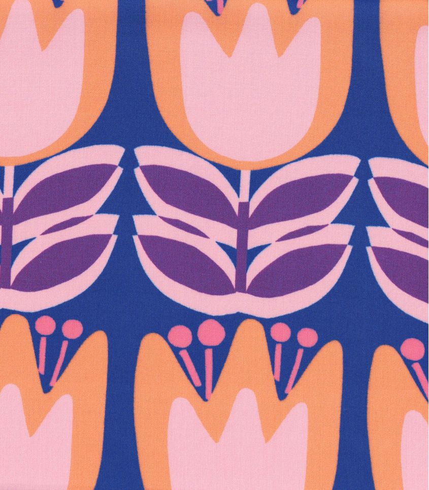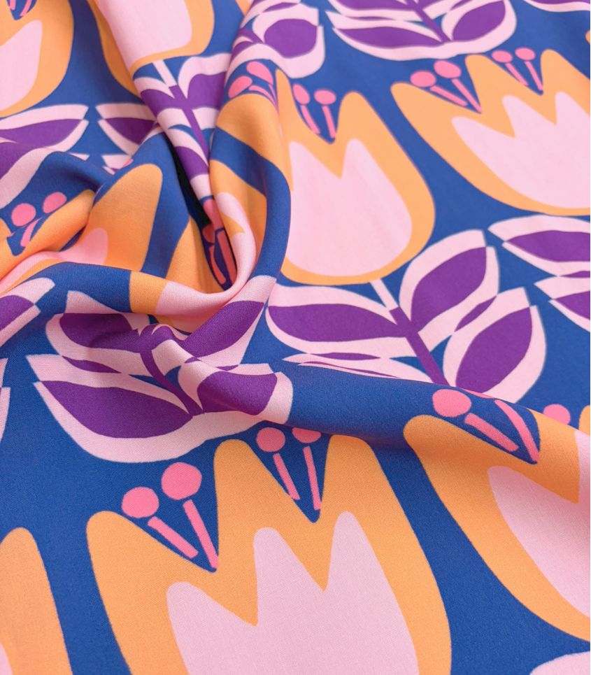 Tissu en viscose imprimée de tulipes oranges et roses sur fond et bleu roi. Imprimé joyeusement pop. Cette viscose fine et fluide sera parfaite pour réaliser des blouses, chemises, vêtements pour enfant.