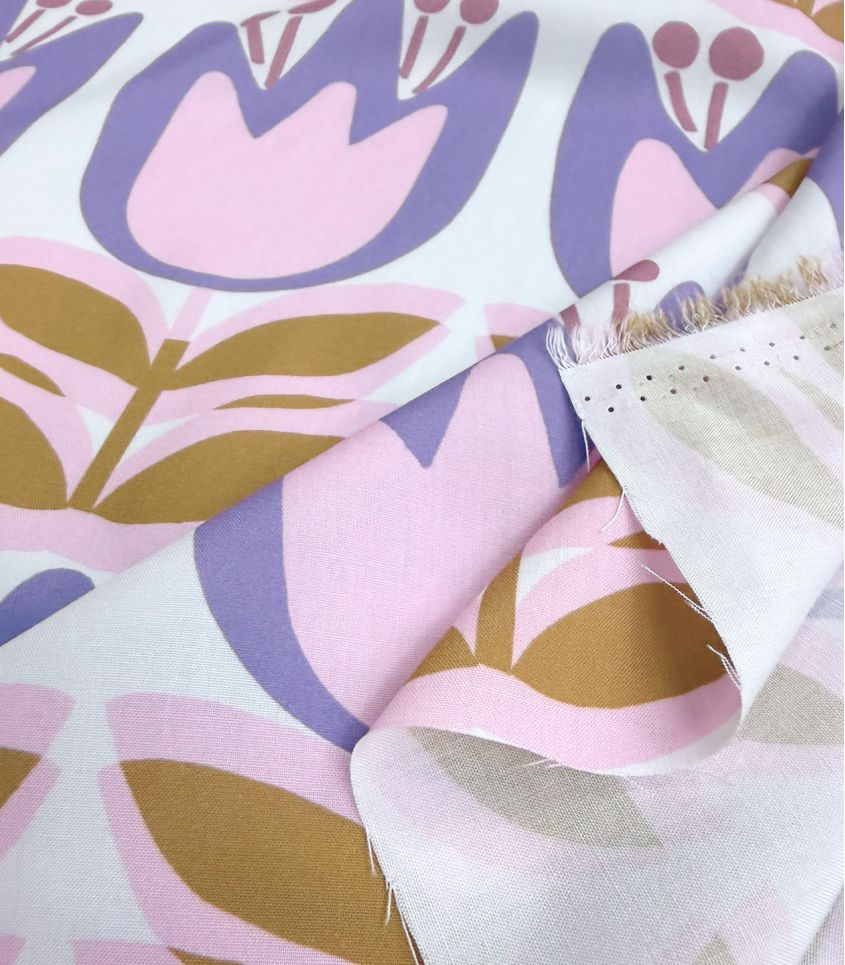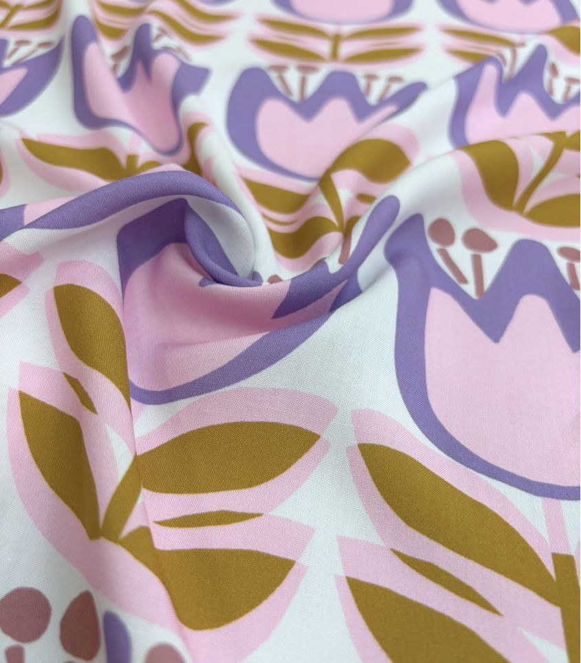 Tissu en viscose imprimée de tulipes roses et parme sur fond et blanc. Imprimé joyeusement pop. Cette viscose fine et fluide sera parfaite pour réaliser des blouses, chemises, vêtements pour enfant.