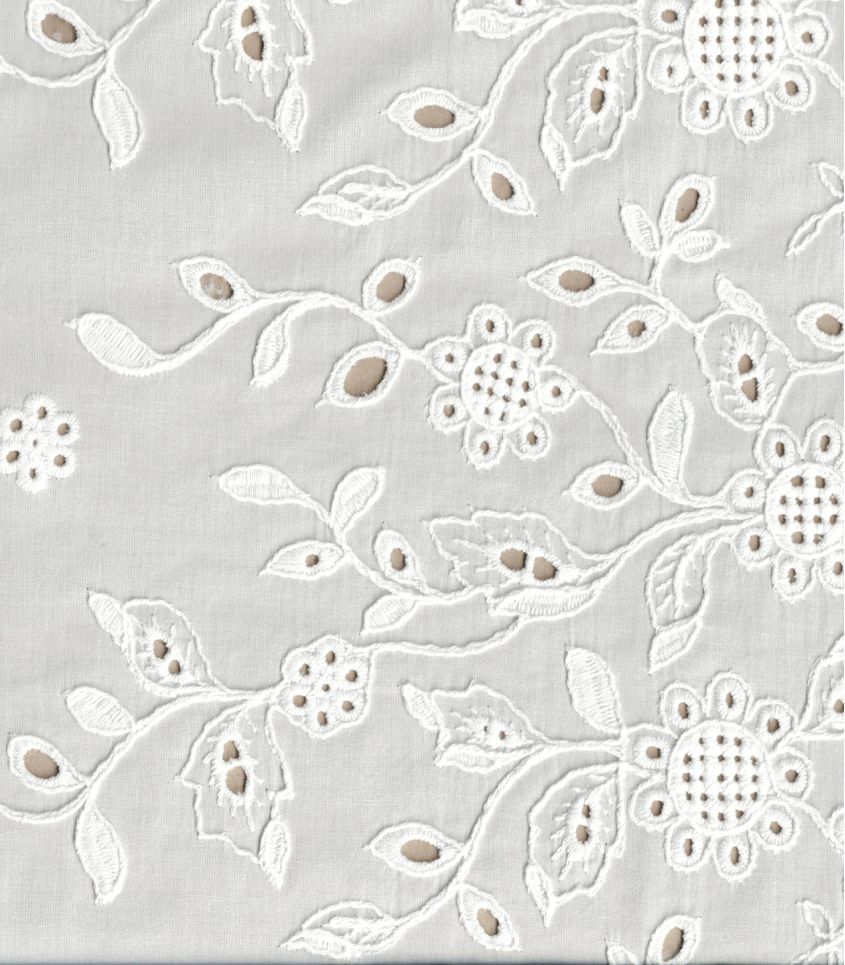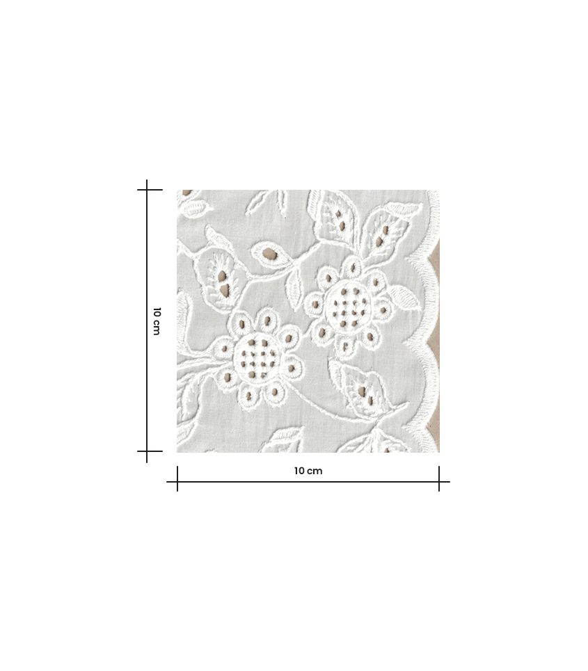 Voile de coton écru brodé sur une lisière de fleurs et de feuilles délicatement ajourées. Le bord festonné permet de créer de jolies bordures de manches ou bas de vêtements. Ce voile sera subtilement transparent et nécessitera une doublure selon son utilisation. Attention Une seule lisière est brodée et festonnée.