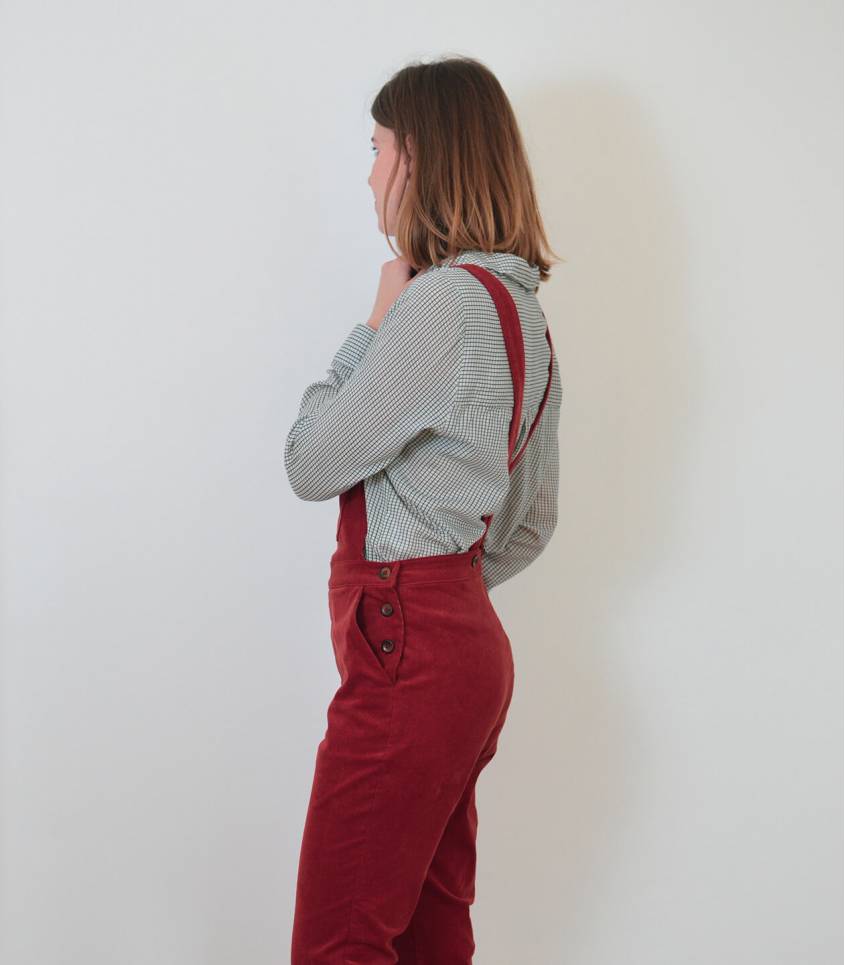 Son pantalon coupe slim et son jeu de bretelles croisées dans le dos ainsi que la possibilité de choisir de jolis boutons en font un modèle agréable à porter et à coudre !