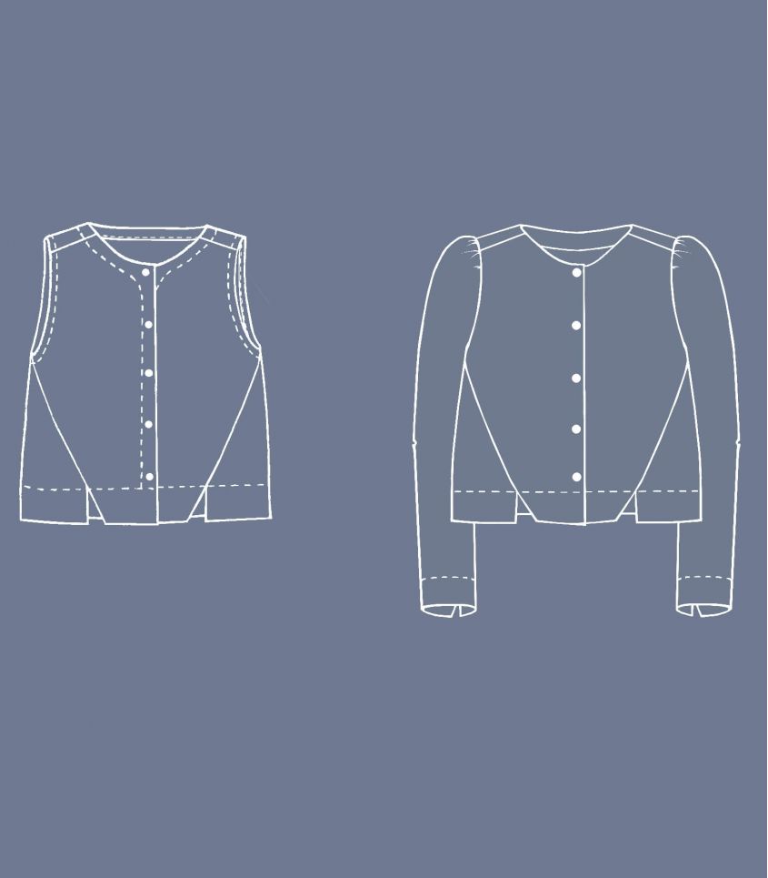 Miette est un top court, à coudre sans manche façon débardeur ou avec manches et doublé pour une version veston. Il se caractérise par un subtil jeu de fentes: les coutures côtés sont déviées vers l’avant jusqu’à la taille et celles des manches reprennent le même principe.