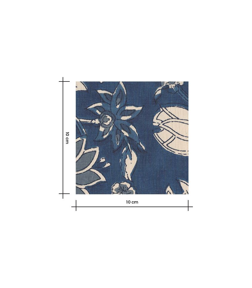 Son fond bleu marine est parsemé de grandes fleurs écrues et bleu gris, pour un rendu graphique et poétique à la fois.