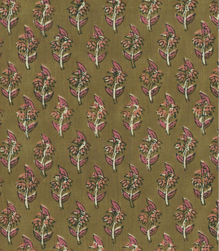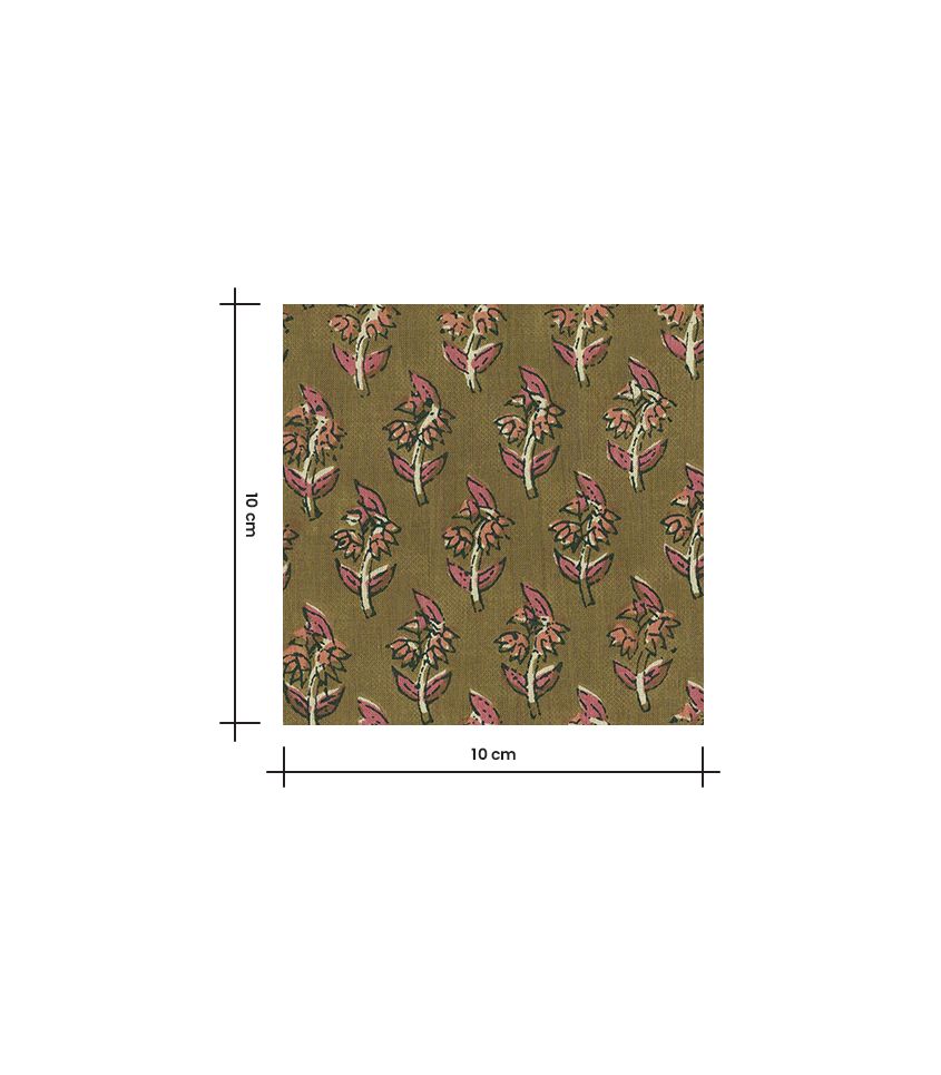 Imprimé d'un motif floral beige et rose sur un fond vert bronze.