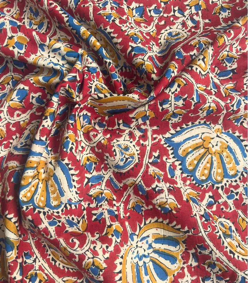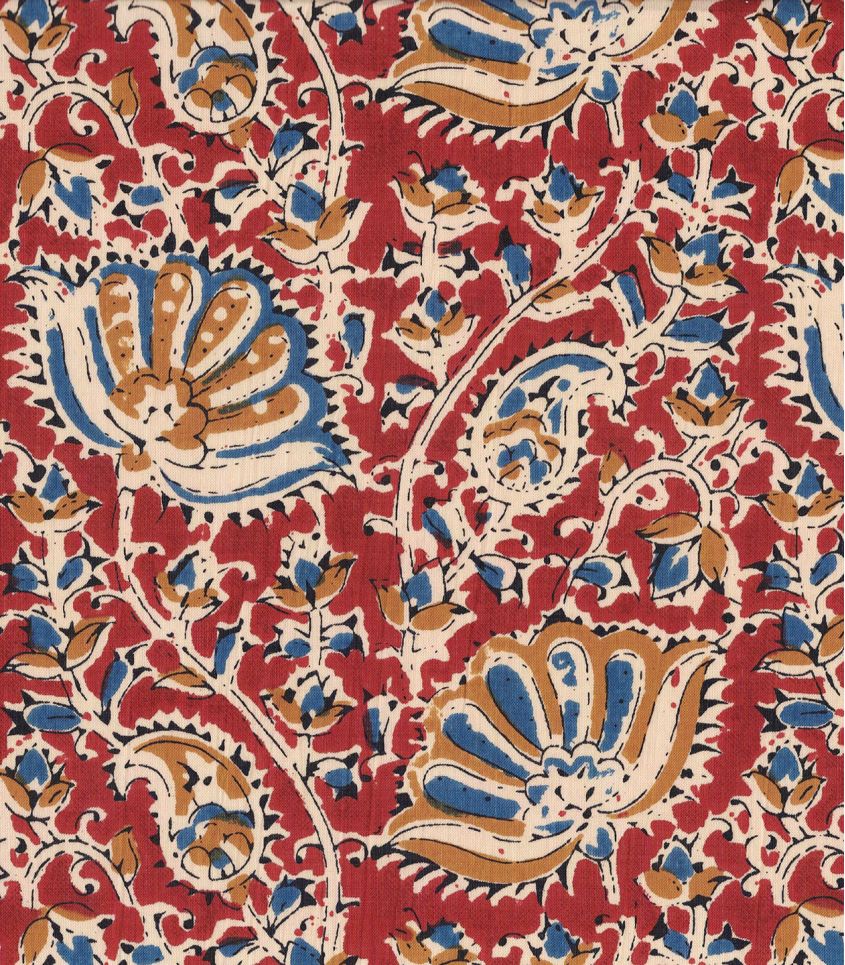 Imprimé d'un motif floral écru souligné de beige et de bleu sur un fond brique.